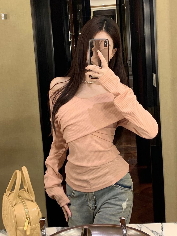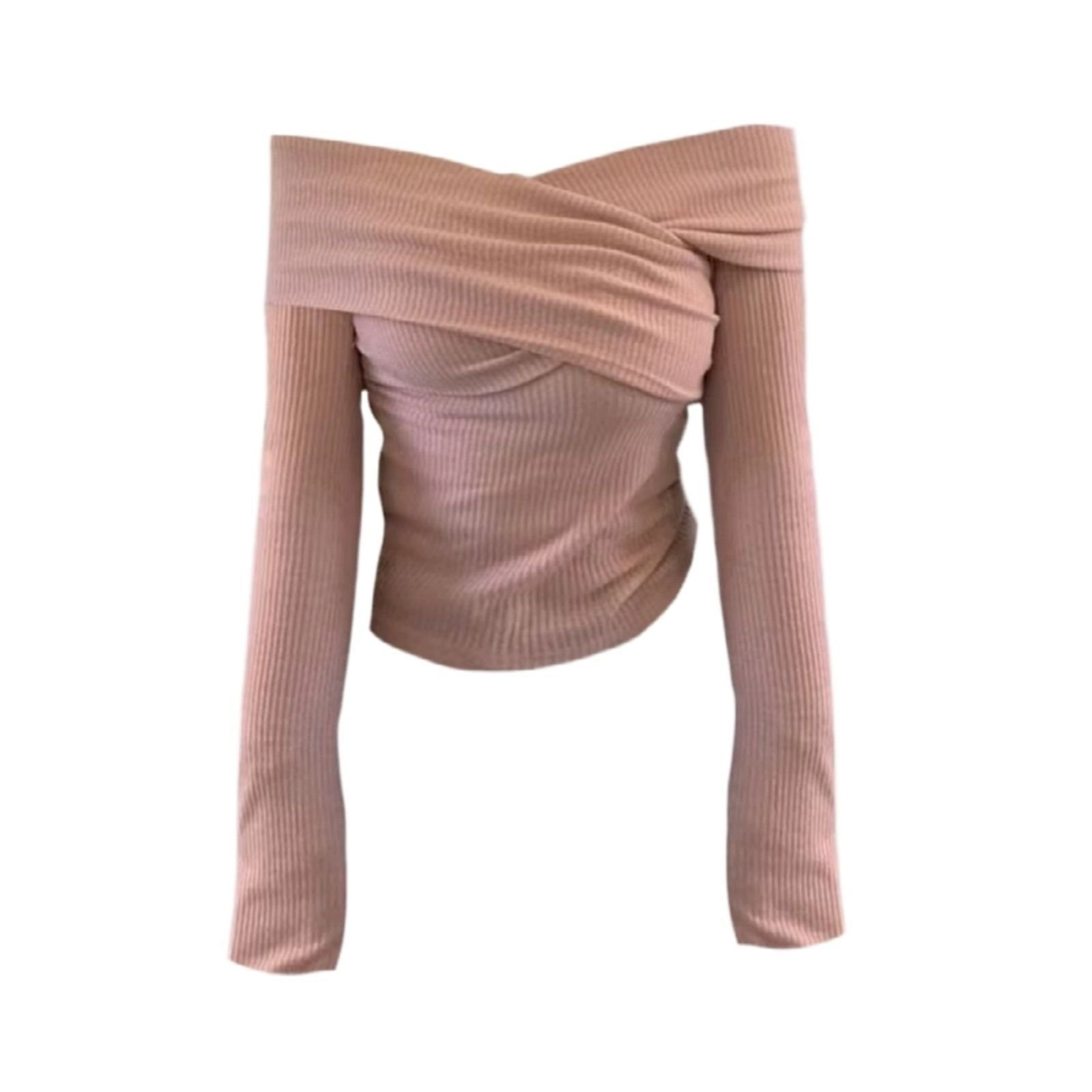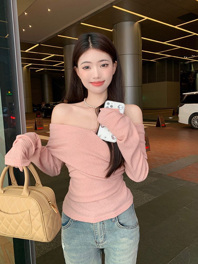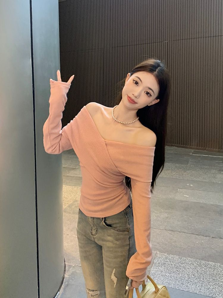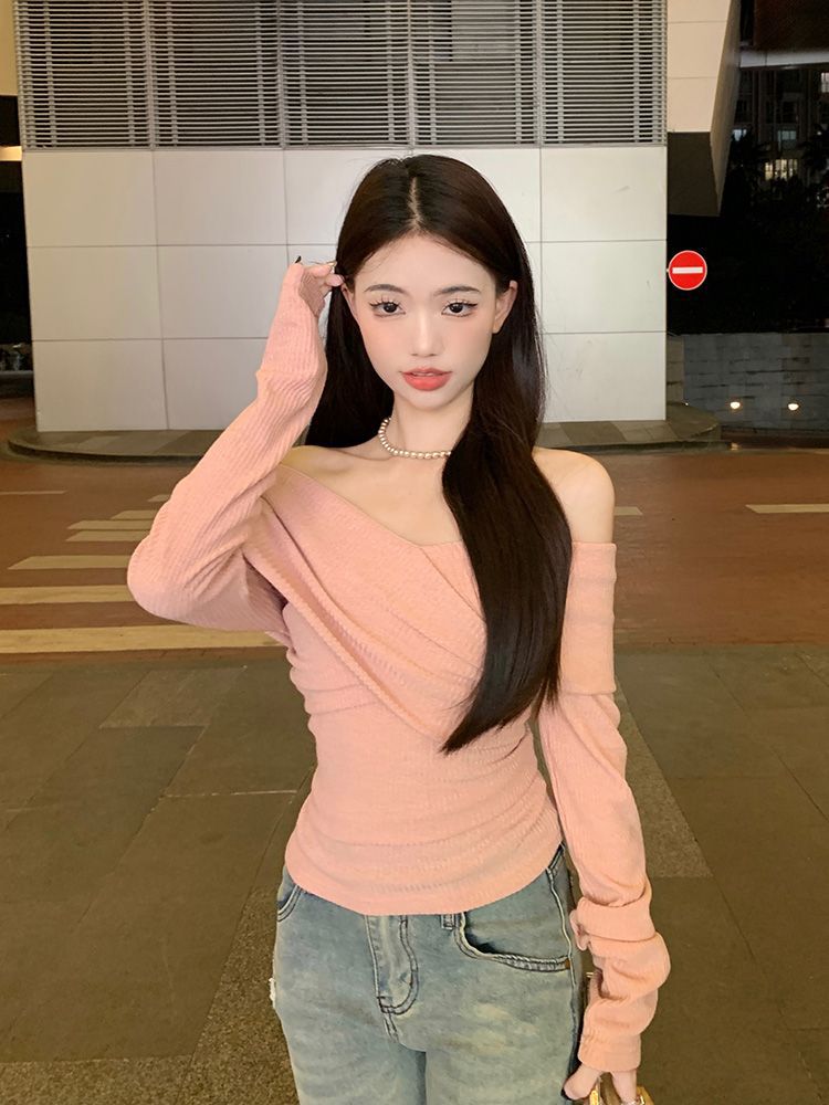Soft One-Shoulder Pink Women’s Fitted Slim Long Sleeve Top