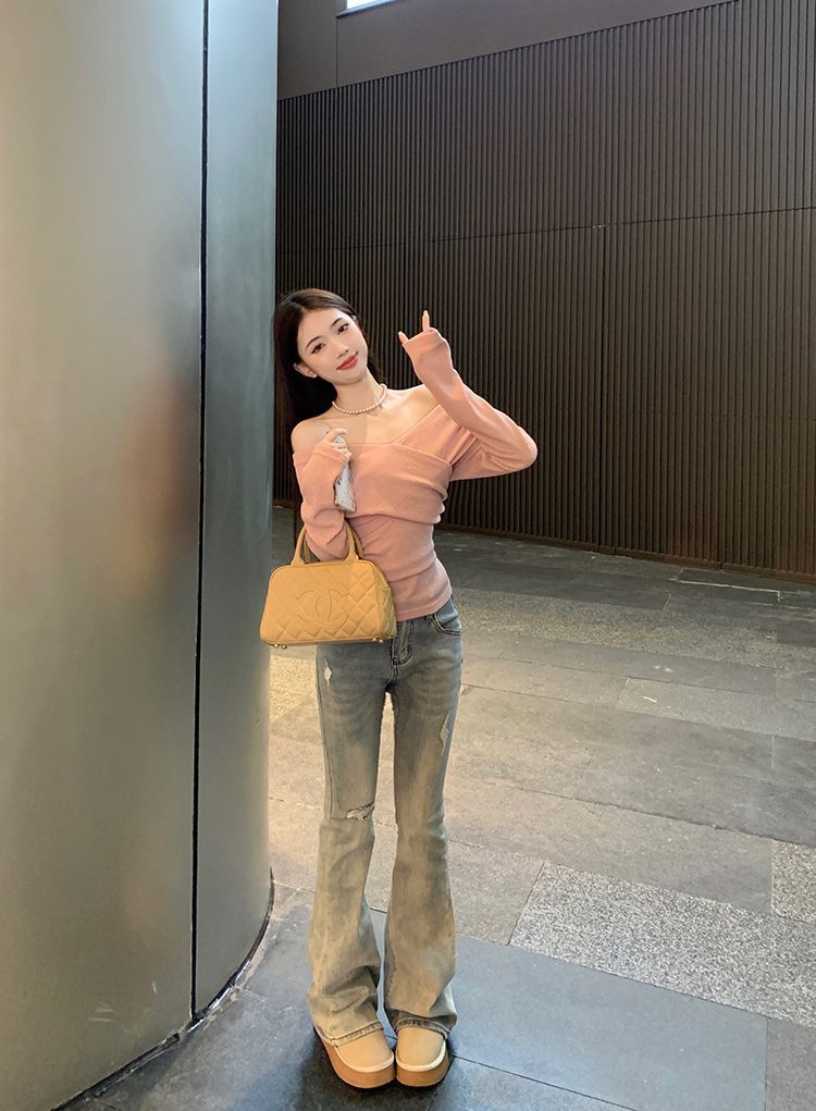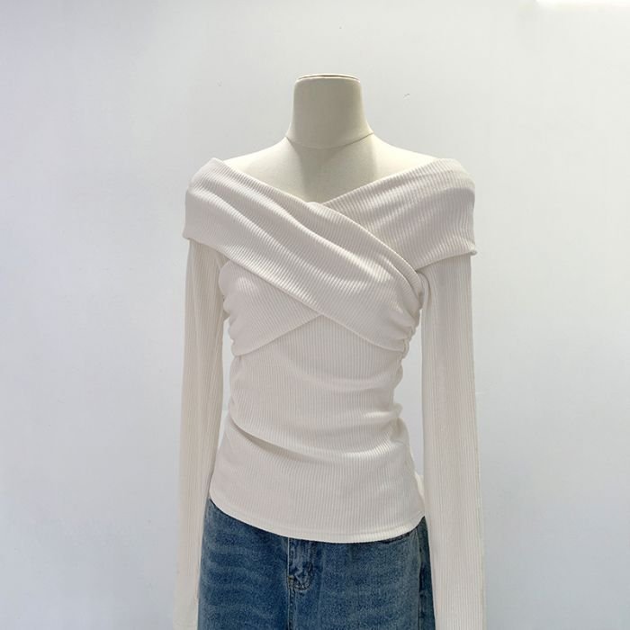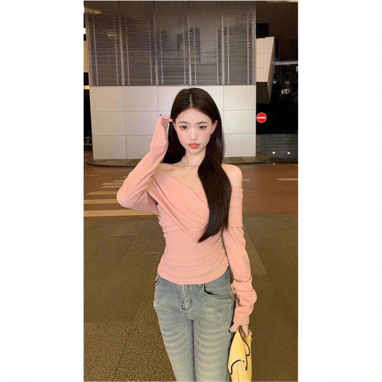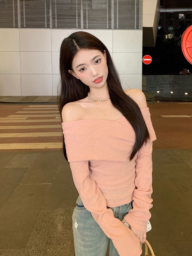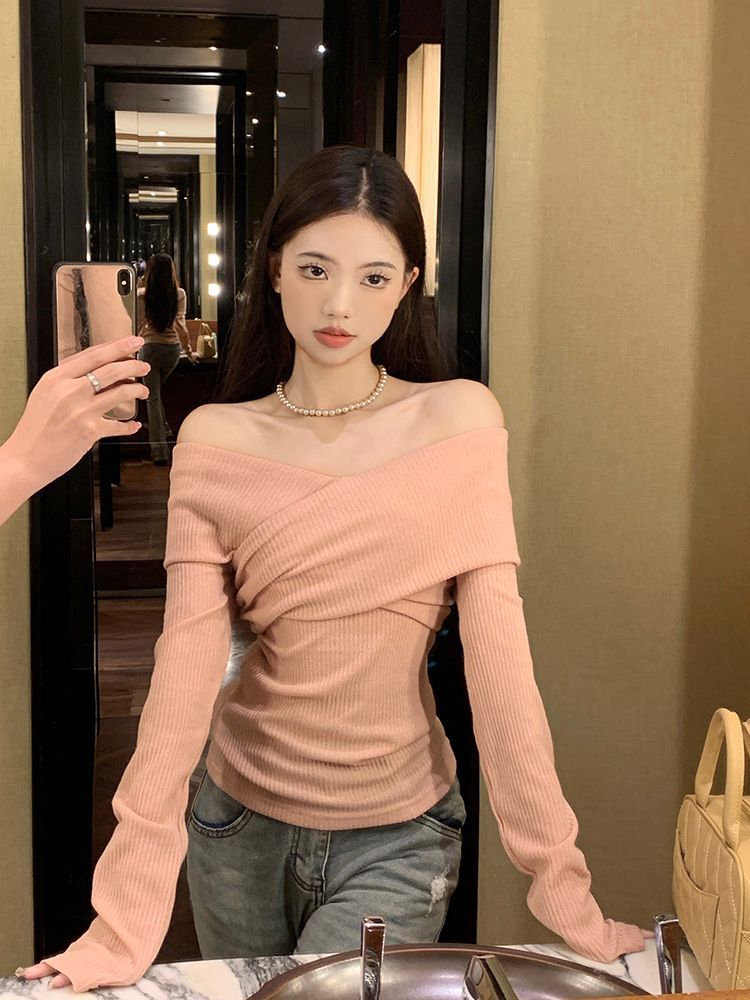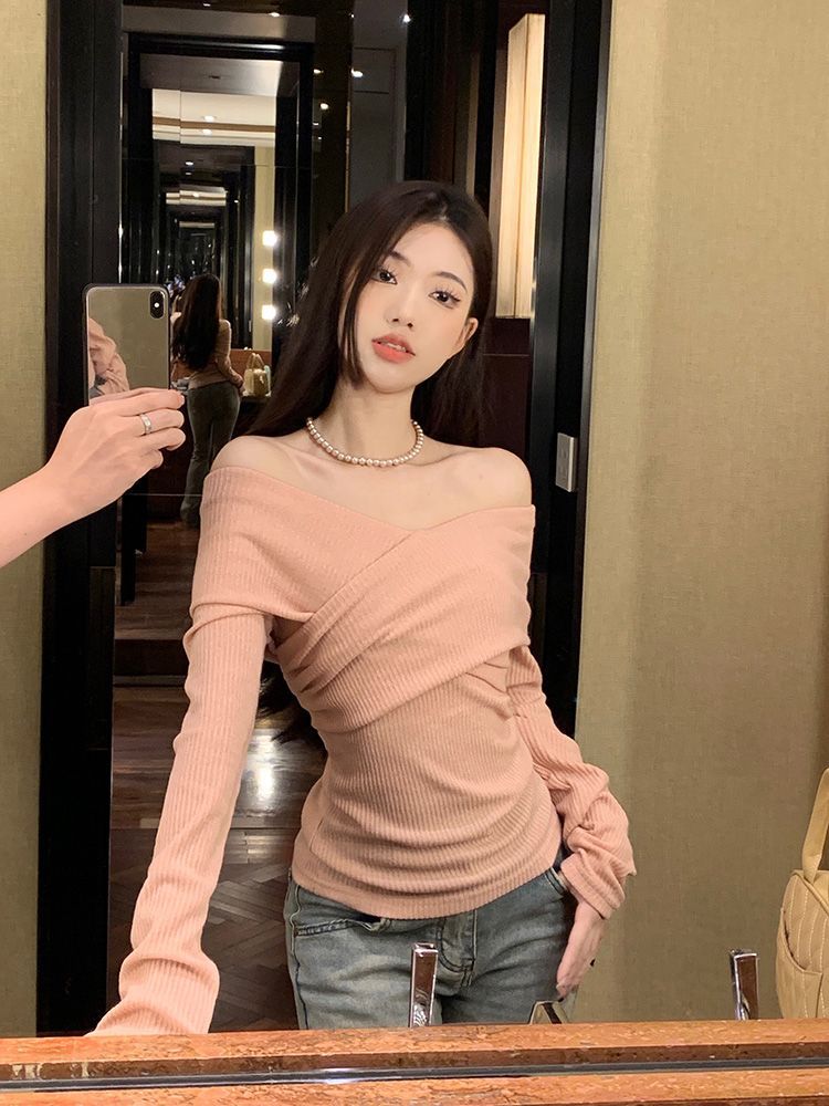 Soft One-Shoulder Pink Women’s Fitted Slim Long Sleeve Top